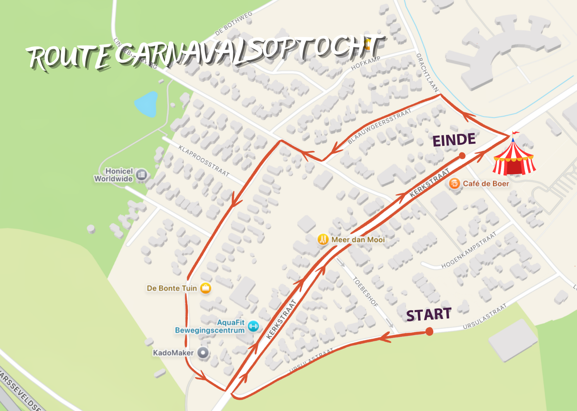De optocht start in de Ursulastraat. Op de kaart hieronder ziet u hoe de optocht door Harreveld zal trekken. Langs de gehele route is er voldoende gelegenheid de wagens en loopgroepen van dichtbij te bekijken. De gehele middag is de feesttent op het Meester Nijsplein geopend. U kunt hier terecht voor diverse drankjes en er zijn toiletvoorzieningen aanwezig.